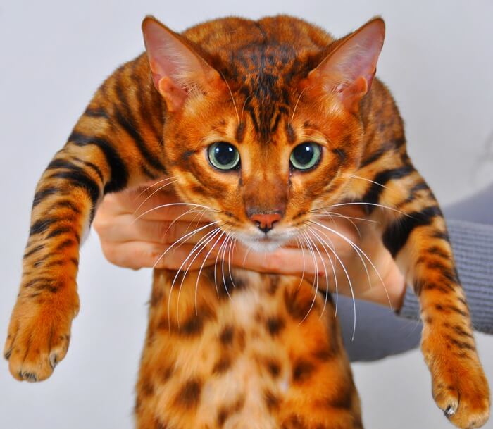 По внешнему виду этот кот с золотисто-оранжевым окрасом — настоящий мини-леопард. По всему его телу виднеются пятна черного или шоколадного цвета. Движения бенгала полны изящества, а в характере сплелись черты дикого зверя и домашней кошки. Эти звери преданны хозяевам, контактны, и при этом обожают игры в охоту. С удовольствием бегают за бумажкой или игрушечной мышкой.