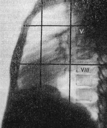 Thwining (1939) предложил еще более детальное деление средостенияна 9 частей. Это схематическое деление достигают путем проведения двух вертикальных линий во фронтальной и двух - горизонтальной плоскостях (рис. 231).